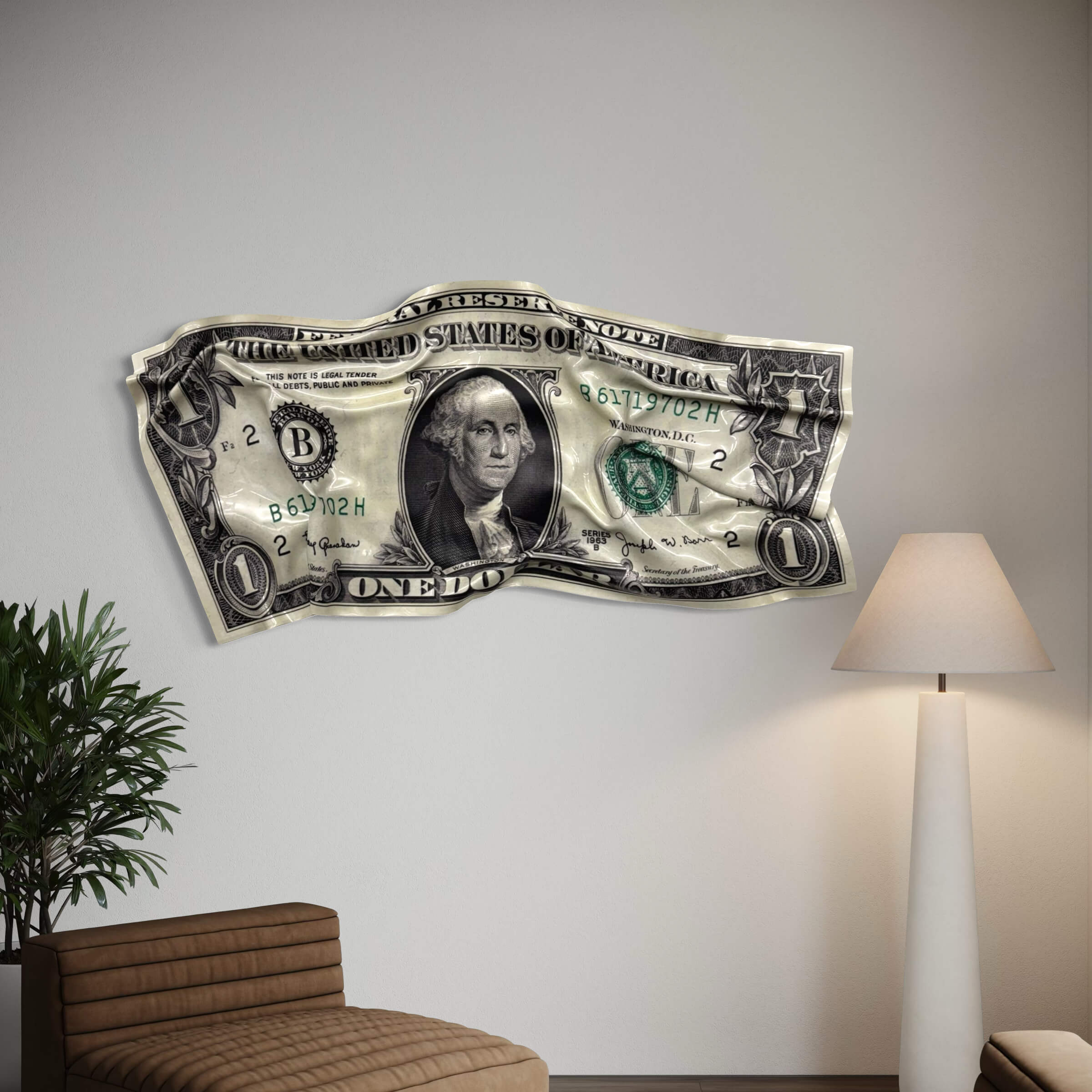 Esta tabla arrugada presenta el famoso billete de 1 dólar, símbolo universal de poder y comercio. El relieve del arrugado transforma esta moneda ordinaria en una obra singular, llena de significado y carácter. Una pieza minimalista e impactante, entre la cultura pop y la reflexión sobre el valor.