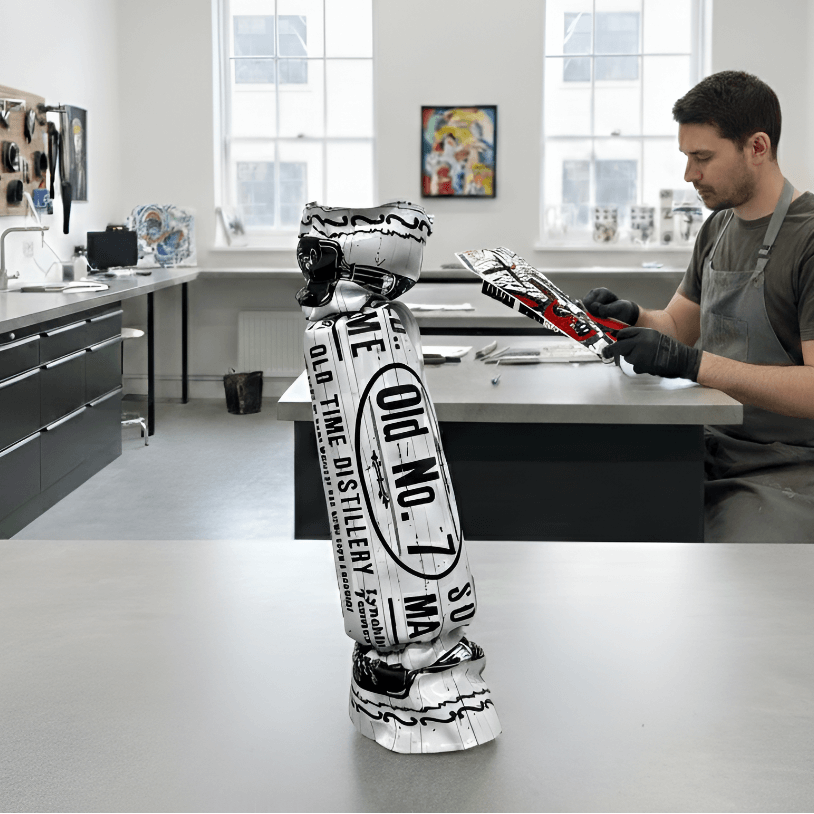 Cette sculpture détourne l’esthétique d’une bouteille mythique pour en faire une pièce artistique forte et audacieuse. Les plis et la torsion donnent du mouvement à la silhouette, transformant un symbole intemporel en œuvre design. Entre culture pop et art contemporain, elle impose une présence graphique puissante, idéale pour un intérieur moderne, un espace lounge ou un univers masculin affirmé.